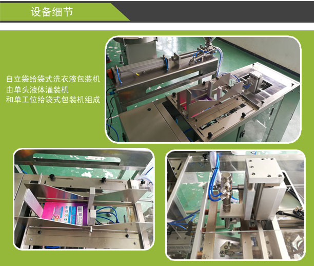 全自動自立袋洗衣液灌裝機是星火新研發(fā)的一款產(chǎn)品,上袋、定量灌裝、封合、切膜、自動計數(shù)一次性自動完成,工藝流程部位采用不銹鋼制造,包裝袋熱合、送袋長度、包裝重量、加熱溫度的調整,簡便可靠,連續(xù)灌裝精度高,包裝速度快,維修方便,是用戶致富選擇的理想設備。包裝產(chǎn)品美觀牢靠,外殼、管道、定量泵采用不銹鋼結構,確保衛(wèi)生,符合食品衛(wèi)生的要求