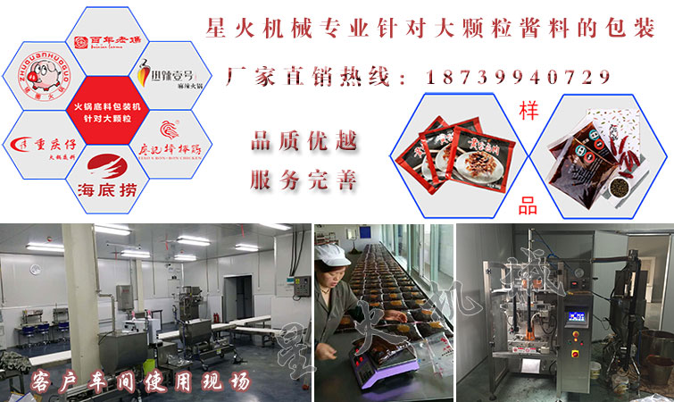 醬料包裝機(jī)系列是星火機(jī)械力推的一系列包裝設(shè)備,也是銷售量較好的機(jī)械設(shè)備,該系列包裝機(jī)主要對(duì)顆粒醬料及粘稠醬料進(jìn)行包裝,如:火鍋底料、豆豉醬、辣椒醬、牛肉醬等各種調(diào)料的包裝,目前我司已經(jīng)與很多知名醬料企業(yè)合作,歡迎廣大新老客戶前來我司考察監(jiān)督。下面幾款醬料設(shè)備就是星火賣的比較好的幾款醬料包裝機(jī)產(chǎn)品。